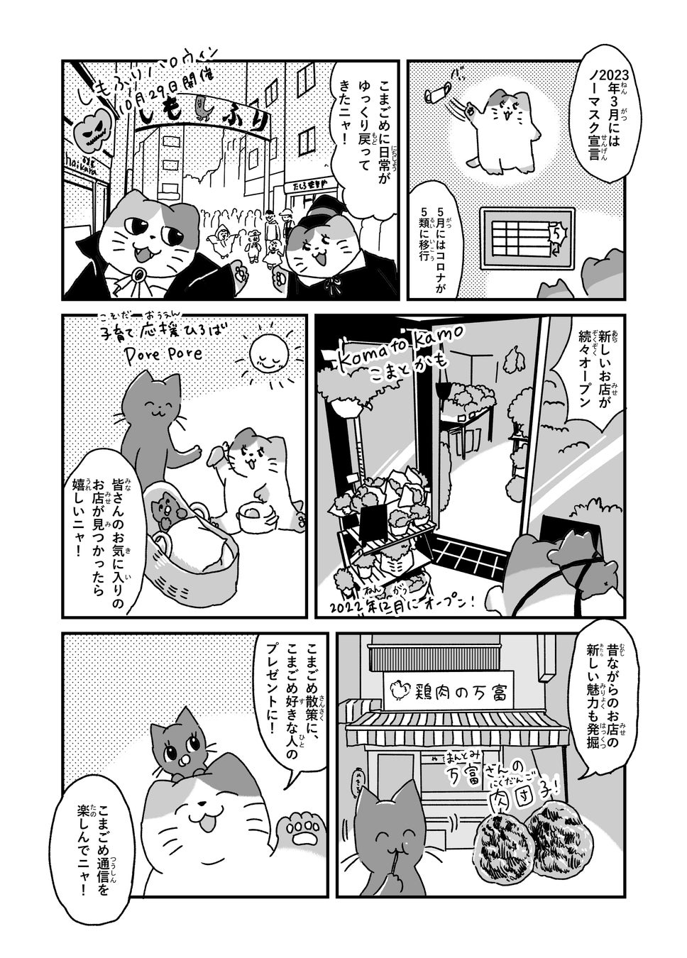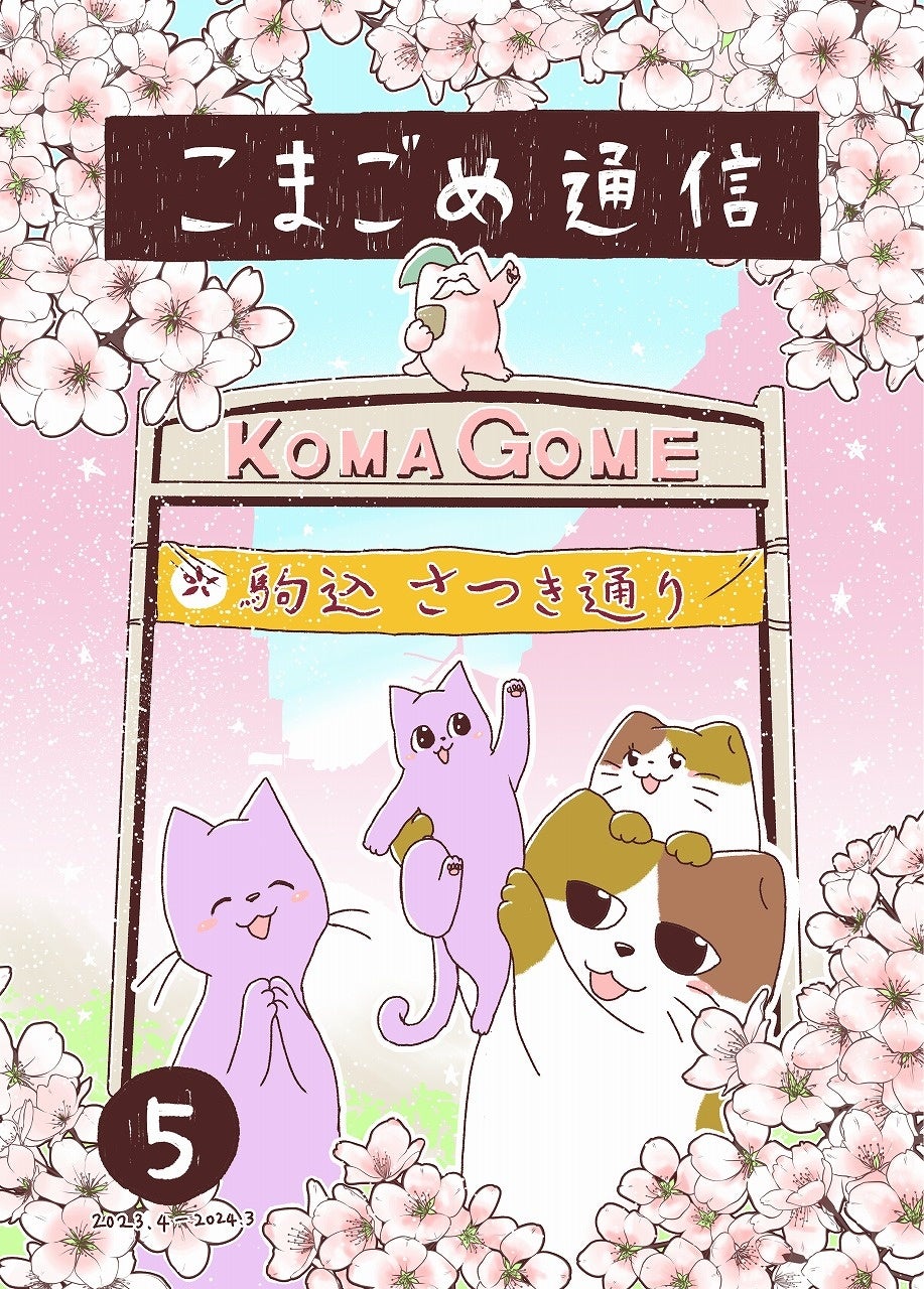 表紙には、こまごめが発祥の地である『ソメイヨシノ』と、こまゴメス、奥さんのコマ子、2022年生まれの息子のしもふり、2024年生まれの娘のさつき、桜の精のそめいじい、駒込さつき通りが描かれています。