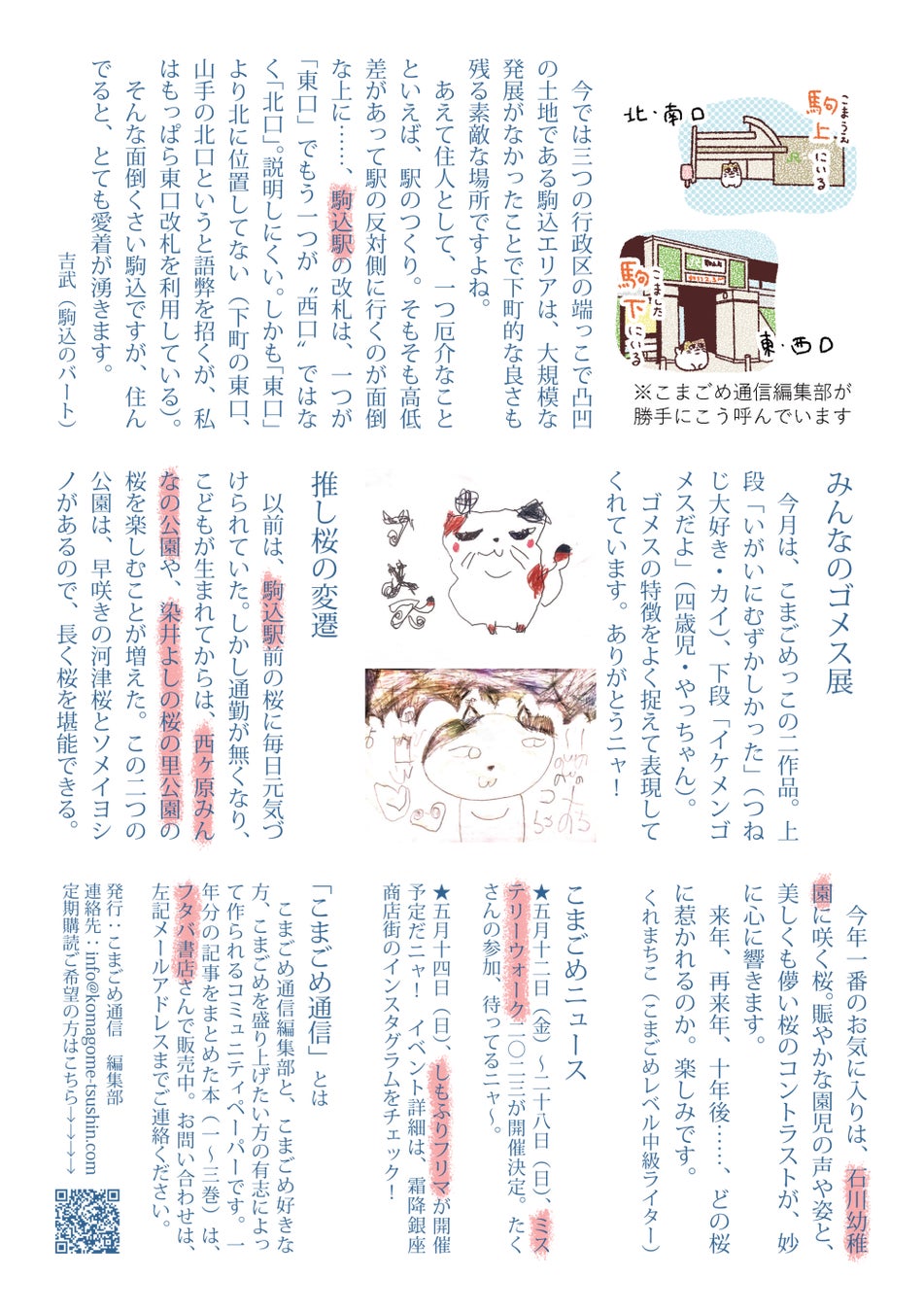 フェイスブックグループ『こまごめを楽しみ隊』では、5,344名(2024/4時点)の”こまごめ人”により毎日こまごめ情報が紹介される。その情報を基に発行されるコミュニティペーパー『こまごめ通信』。2019年4月より毎月発行。