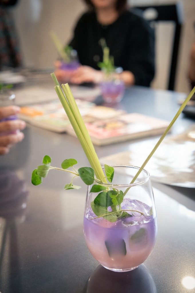 ハーブの色で作られた美しいウェルカムドリンクが小早川さんから提供されました。