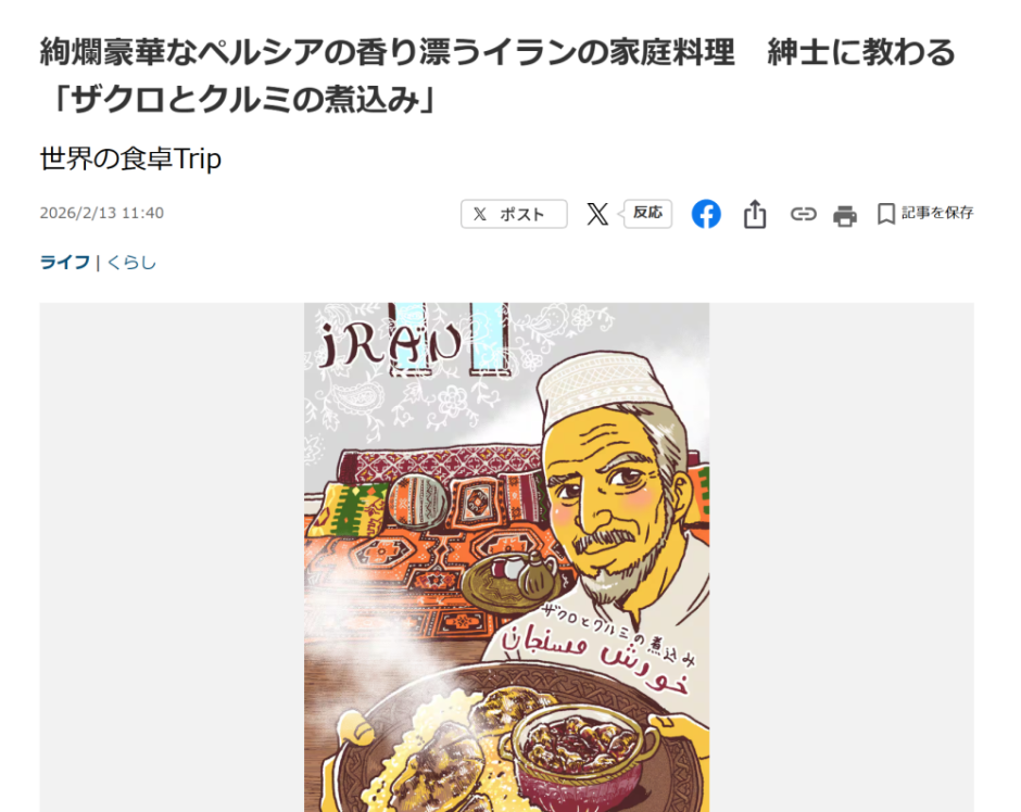 連載「世界の食卓Trip」(産經新聞)第六回目「絢爛豪華なペルシアの香り漂うイランの家庭料理 紳士に教わる「ザクロとクルミの煮込み」」が公開されました