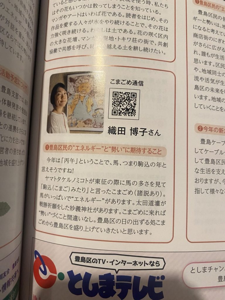 ホームAllArticle仕事実績 worksメディア media 「令和八年 ひのえうまの年 豊島区民の”エネルギー”と”勢い”に期待しよう」にこまごめ通信がコメントを寄せました(「とっぴぃ」豊島の選択)にて紹介されました 2026/02/28 SHARE ツイート シェア はてブ LINE Pocket 豊島区がもっと好きになる情報誌「とっぴい 豊島の選択」にて、新年のコメントを寄せさせていただきました! 駒込の年と言えそうな「丙午」。豊島区の日の出ずる処、というワードが気に入っています。